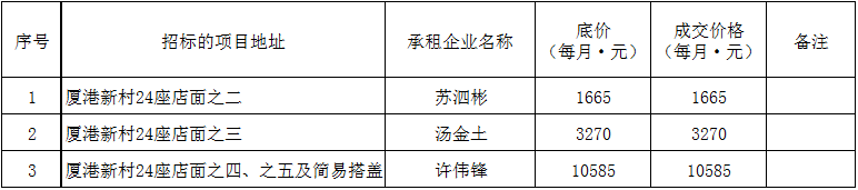 根據(jù)思明區(qū)國有企業(yè)資產(chǎn)出租管理的相關(guān)制度,我司2019年5月28日上午9:00起于觀音山營運(yùn)中心2號(hào)樓2層2號(hào)會(huì)議室進(jìn)行公開招租現(xiàn)場開標(biāo),現(xiàn)通過思明控股網(wǎng)站對(duì)外發(fā)布成交公告,內(nèi)容如下: