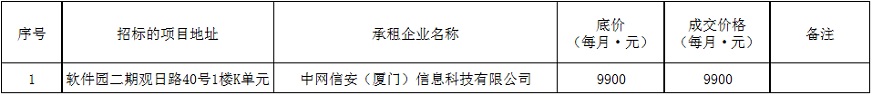 根據(jù)思明區(qū)國(guó)有企業(yè)資產(chǎn)出租管理的相關(guān)制度,我司2019年6月10日上午9:00起于觀音山營(yíng)運(yùn)中心2號(hào)樓2層2號(hào)會(huì)議室進(jìn)行公開(kāi)招租現(xiàn)場(chǎng)開(kāi)標(biāo),現(xiàn)通過(guò)思明控股網(wǎng)站對(duì)外發(fā)布成交公告,內(nèi)容如下: