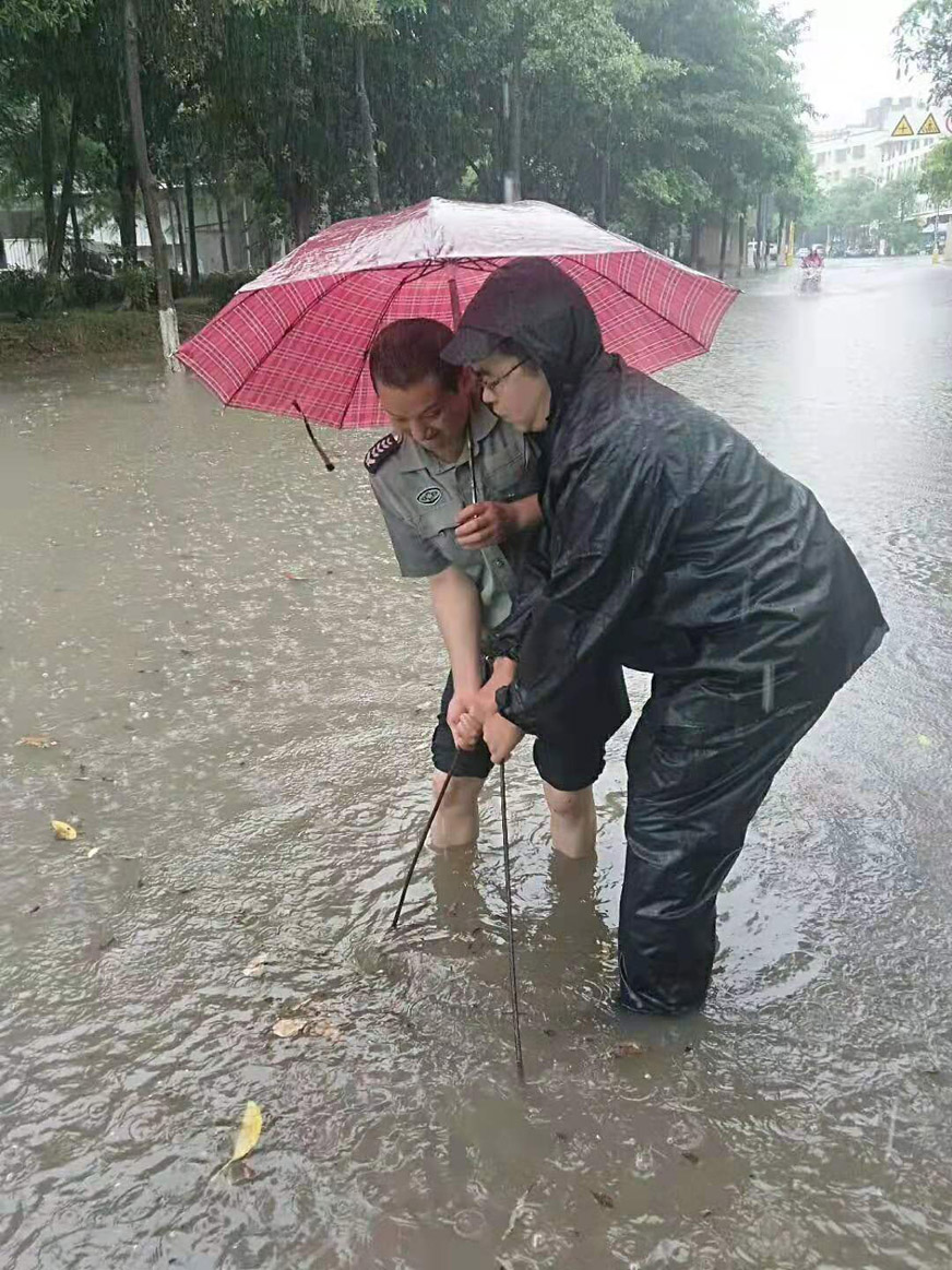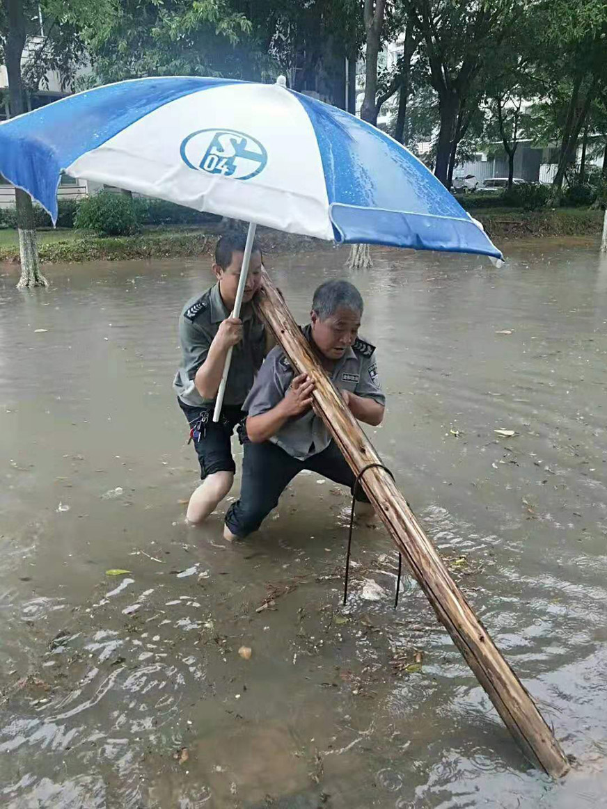 情況緊急,廈門市全和物業(yè)管理有限公司同安工業(yè)集中區(qū)思明園管理中心立即出動突發(fā)事件應急小分隊,任務只有一件,就是清理排水口,恢復道路通行秩序。頂著瓢潑大雨,他們用雙手扒、用鐵鍬鏟、用木棍撬……掀開數(shù)十個沉重的排水井蓋。積水很快就順溝而下。為了車輛及行人安全,他們在掀開井蓋,排水井前沿指揮交通?;疑闹品缫褲裢?,臉上已分不清是雨水還是汗水。通行無阻的行人和車輛看著這一切,不知心中是否感受到物業(yè)人滿滿的暖意。
