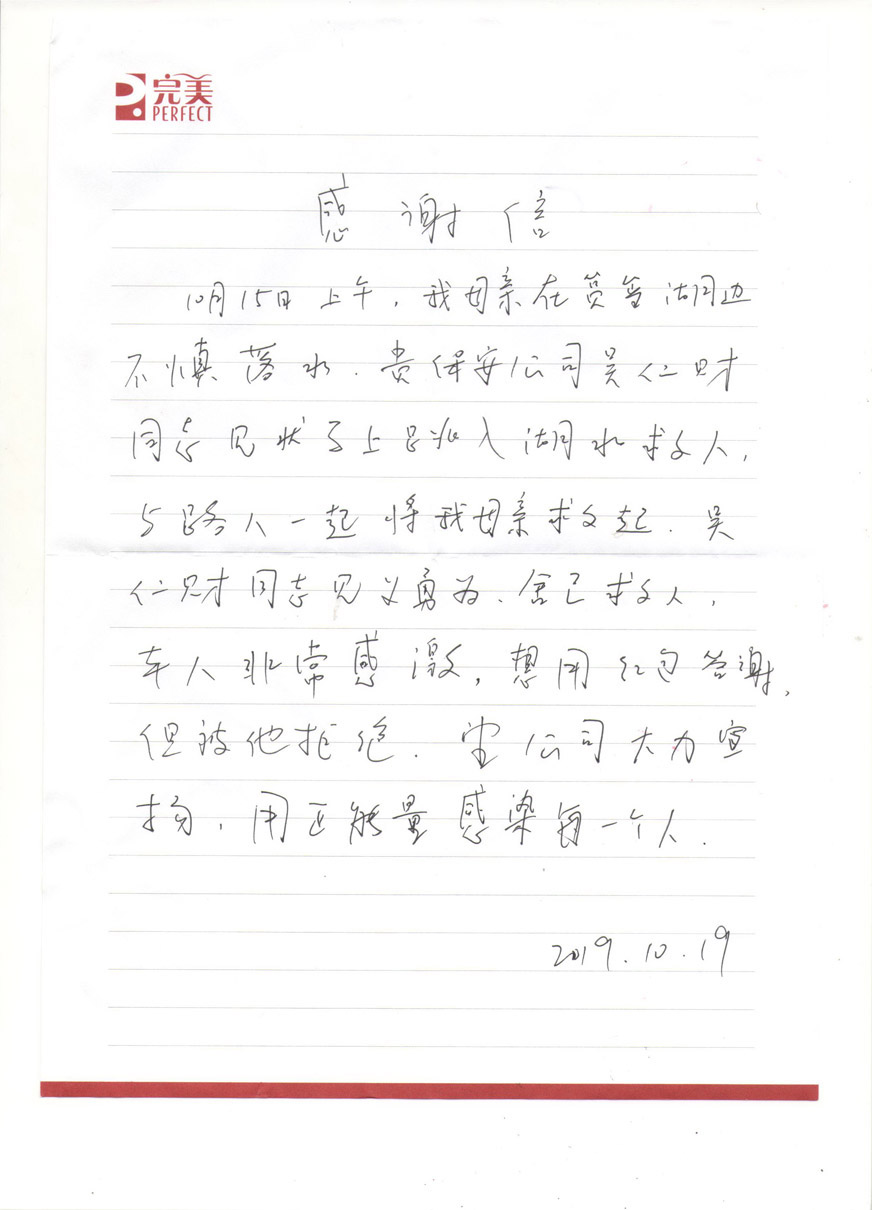 “關(guān)于老人摔倒扶不扶的問題,很多人談之色變,面對群眾危難,不會游泳的吳仁財沒有選擇冷漠和逃避,而是不懼危險,挺身而出、沉著冷靜、奮勇救人,真是驚心動魄,當(dāng)時水已經(jīng)淹到我母親胸口位置,情況萬分危急,若是再晚一分鐘施救就陰陽相隔了……吳仁財同志也是挽救了我們整個家庭!”被救的老婦人兒子章先生情緒十分激動,噙著淚花如是說,一再感謝善良保安員吳仁財同志的救命之恩并準(zhǔn)備了紅包答謝,被吳仁財同志婉言謝絕了。