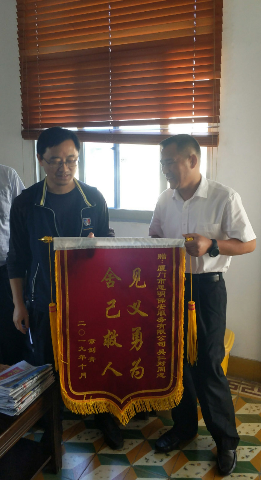 近日,市民章先生專程帶著一面印有“見義勇為,舍己救人”字樣的錦旗和一封感謝信到思明保安公司,緊握著葉總經(jīng)理的手連聲致謝,感謝保安員吳仁財同志奮不顧身救起不慎落水的老母親,同時請求保安公司要大力弘揚(yáng),學(xué)習(xí)吳仁財同志恪盡職守、不懼危險,奮勇救人的高尚品質(zhì),引領(lǐng)時代新風(fēng)尚,傳遞社會正能量。
