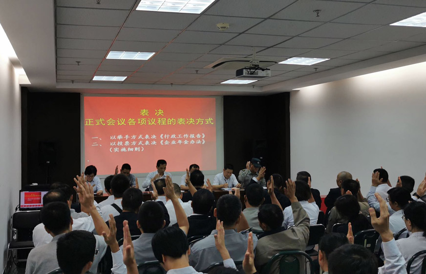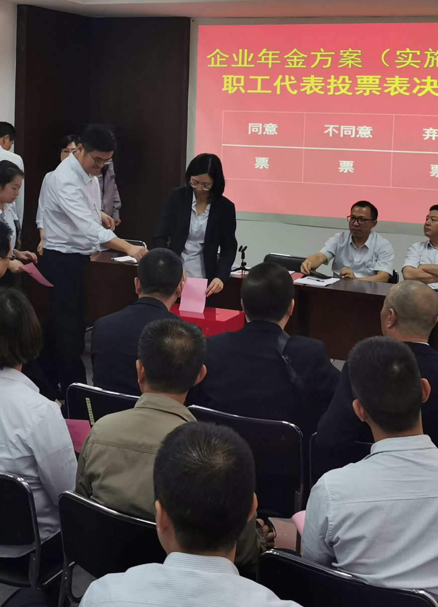 行政部負(fù)責(zé)人向大會作了《企業(yè)年金方案》的講解和說明,職工代表分組就《企業(yè)年金方案(實(shí)施細(xì)則)》進(jìn)行討論,最后與會職工代表以無記名投票方式表決通過了《企業(yè)年金方案(實(shí)施細(xì)則)》。