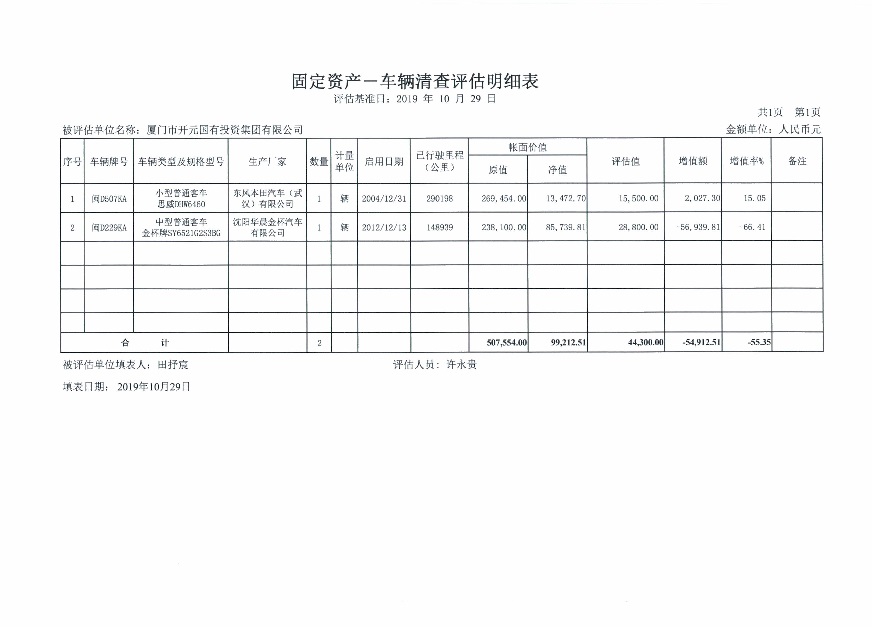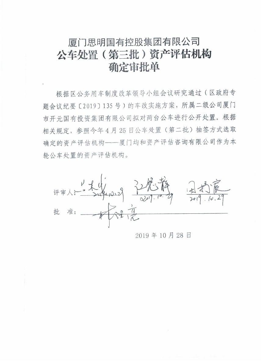 根據(jù)廈門市思明區(qū)人民政府關(guān)于區(qū)屬國企車改實施方案專題會議紀(jì)要(〔2019〕135號)及思明控股《關(guān)于落實車改實施方案相關(guān)事宜的通知》(思明控股辦〔2019〕9號)文的相關(guān)精神。我司委托廈門均和房地產(chǎn)土地評估咨詢有限公司對公車處置(第三批)的資產(chǎn)進行評估,該公司已向我司提交資產(chǎn)評估結(jié)果初稿。現(xiàn)將評估結(jié)果進行公示,如有異議,歡迎來電來函反映。