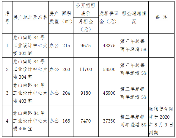 根據(jù)國有企業(yè)資產出租管理相關制度,我司決定對位于思明區(qū)龍山南路84號工業(yè)設計中心3至4層房產對符合入駐條件的意向承租人進行公開競價招租,具體信息如下: