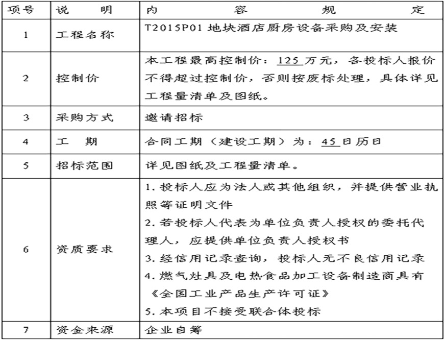 萬豐果業(yè)招標公告(T2015P01地塊酒店廚房設備采購及安裝招標公告)