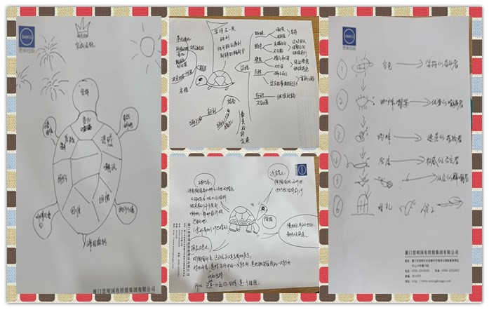 在閱讀繪本《犟龜》后,讀書沙龍會(huì)進(jìn)入第二個(gè)環(huán)節(jié)“多動(dòng)筆”,通過梳理故事情節(jié)、組內(nèi)分享,繪制思維導(dǎo)圖,記錄各自的感悟,引導(dǎo)小伙伴們形成多思善記的習(xí)慣。