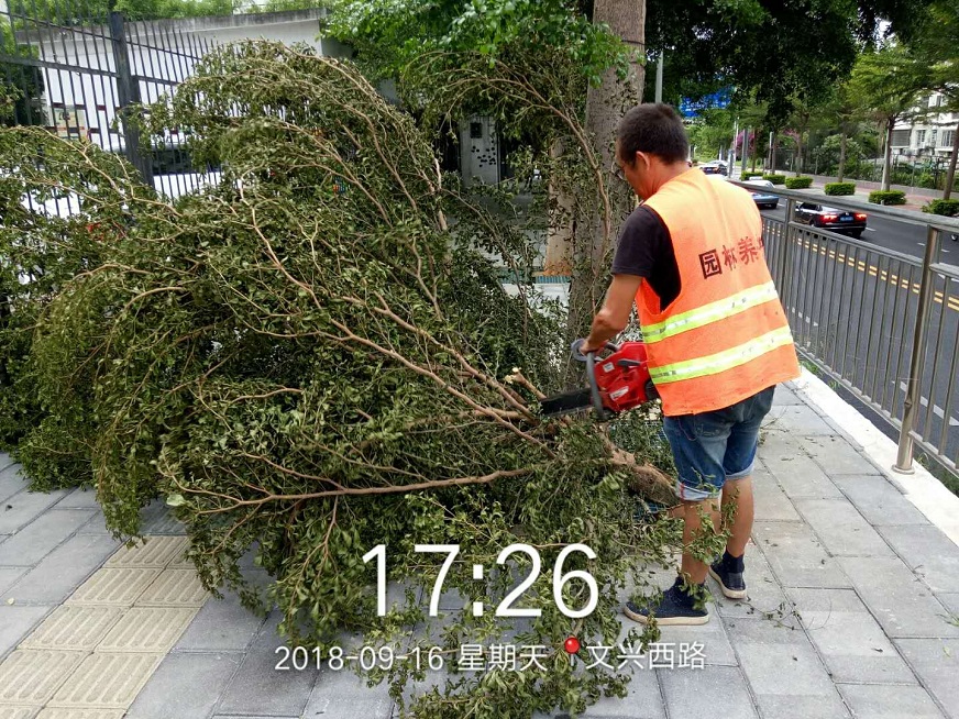9月15日上午,氣象局發(fā)布“臺風預警Ⅲ級”,我司迅速響應,綠化部人員第一時間抵達一線,確保隊伍、設備以及防護措施全部準備就緒。同時,組織工作人員對轄區(qū)內淺根系、樹冠龐大、枝葉過密的園林植物進行重點排查,同步采取疏枝、立柱、綁扎、培土等防御措施,減少樹木應對臺風的受力面積,使防風支架起到更好的支撐和保護作用。本次應急搶險,我司共投入人力212人次,搶險機動車35部,加固樹木182棵,修剪樹木725棵,扶正倒樹傾斜樹29棵,對200多棵樹木的折枝進行鋸除清理。