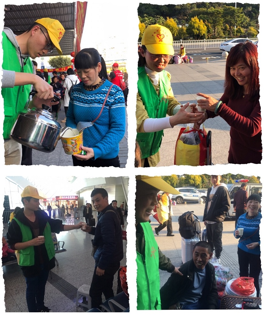 “請問我這張票要去哪里候車?”“請問一下梧村車站怎么走?”支部同志身著志愿者服裝一到場,就有許多受困旅客上前咨詢。每年春運(yùn)期間國內(nèi)各個火車站都會加派人手,做好各項(xiàng)準(zhǔn)備工作。但即便如此,依然會有許多旅客遇到困難,并難以在密集的人群中尋求幫助,在這個時候,分布在火車站各個地方的志愿者就是受困旅客最好的幫手。無論是各個車次的具體候車點(diǎn)、自助取票機(jī)的位置,還是周邊的餐飲、百貨、汽車站路線,甚至旅客需要開水時,志愿者都有隨身攜帶熱水壺和紙杯為旅客提供方便。支部同志們無論走到哪,身邊都會圍繞許多尋求幫助的受困旅客,支部每一位同志都以最飽滿的熱情悉心答疑,以實(shí)際行動為人民服務(wù)。